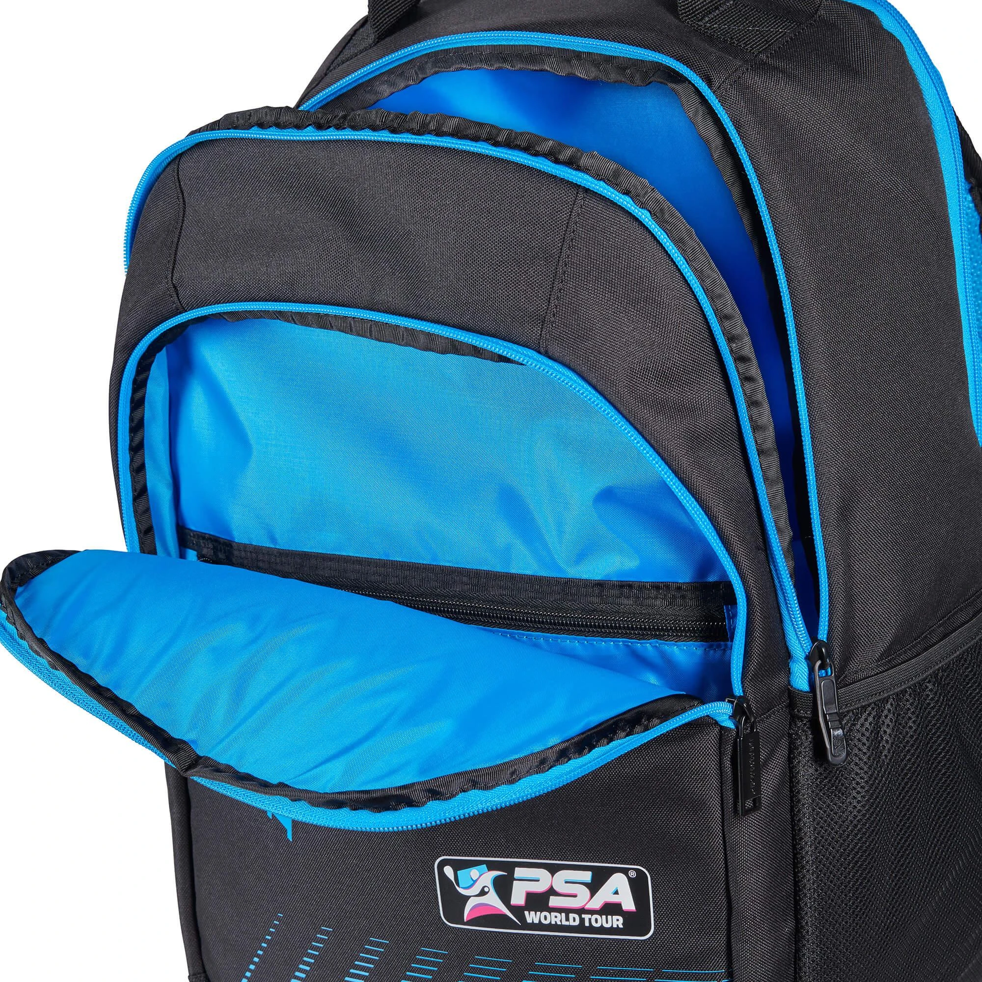 Ideal for players on-the-go who don’t want to carry around a large bag, the PSA Backpack has racquet compartment with space for up to two racquets featuring a velcro strap to hold them in place, a large main compartment for your clothing, towel, and shoes, and a front zipped pocket with some smaller accessory pockets inside for valuables.