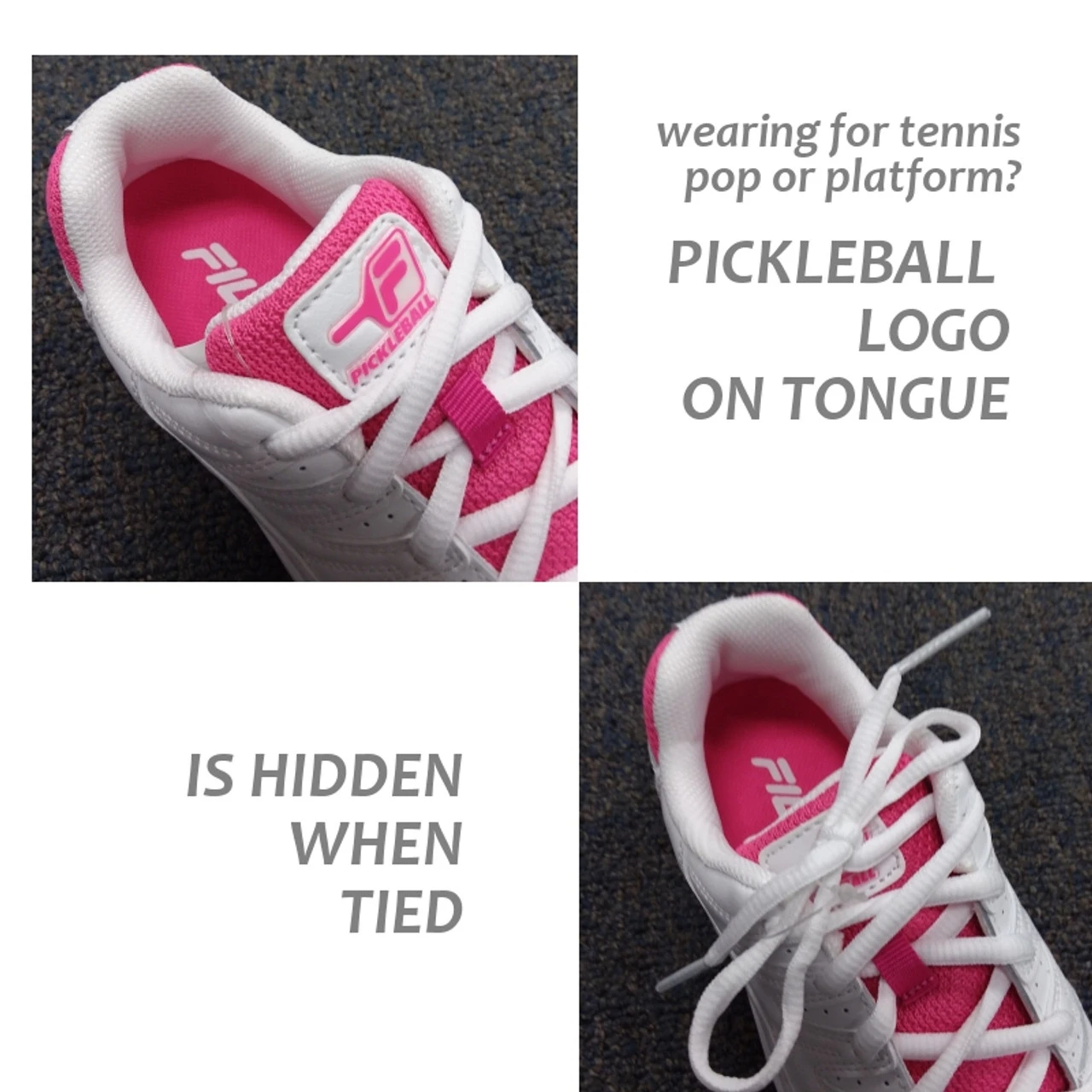 Note: As shown in the photos, this shoe features the word pickleball with a logo of a paddle on the shoe’s tongue. If you are not a fan of that logo, not to worry….once you tie your shoe, the ties sit directly over the paddle logo and it is largely hidden.