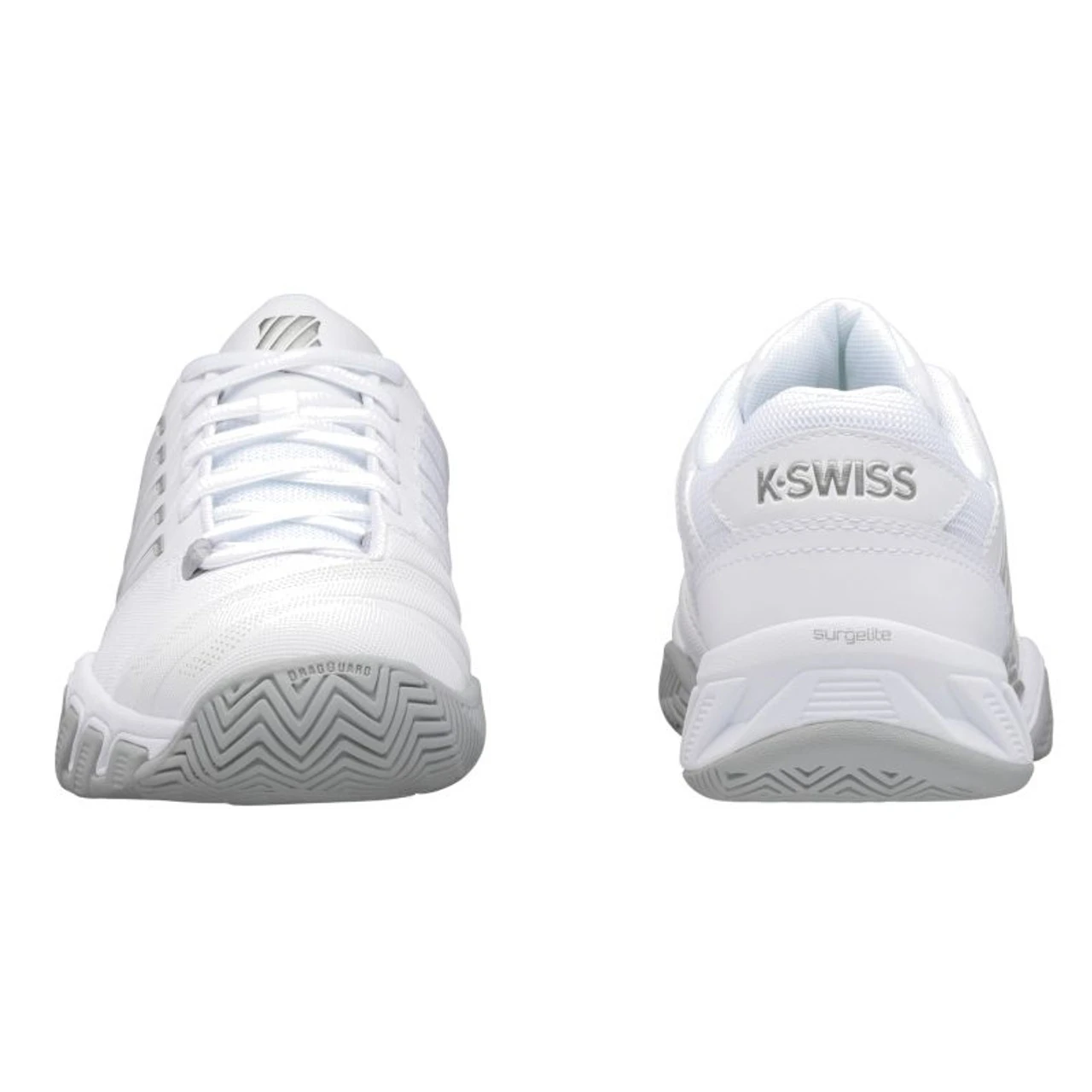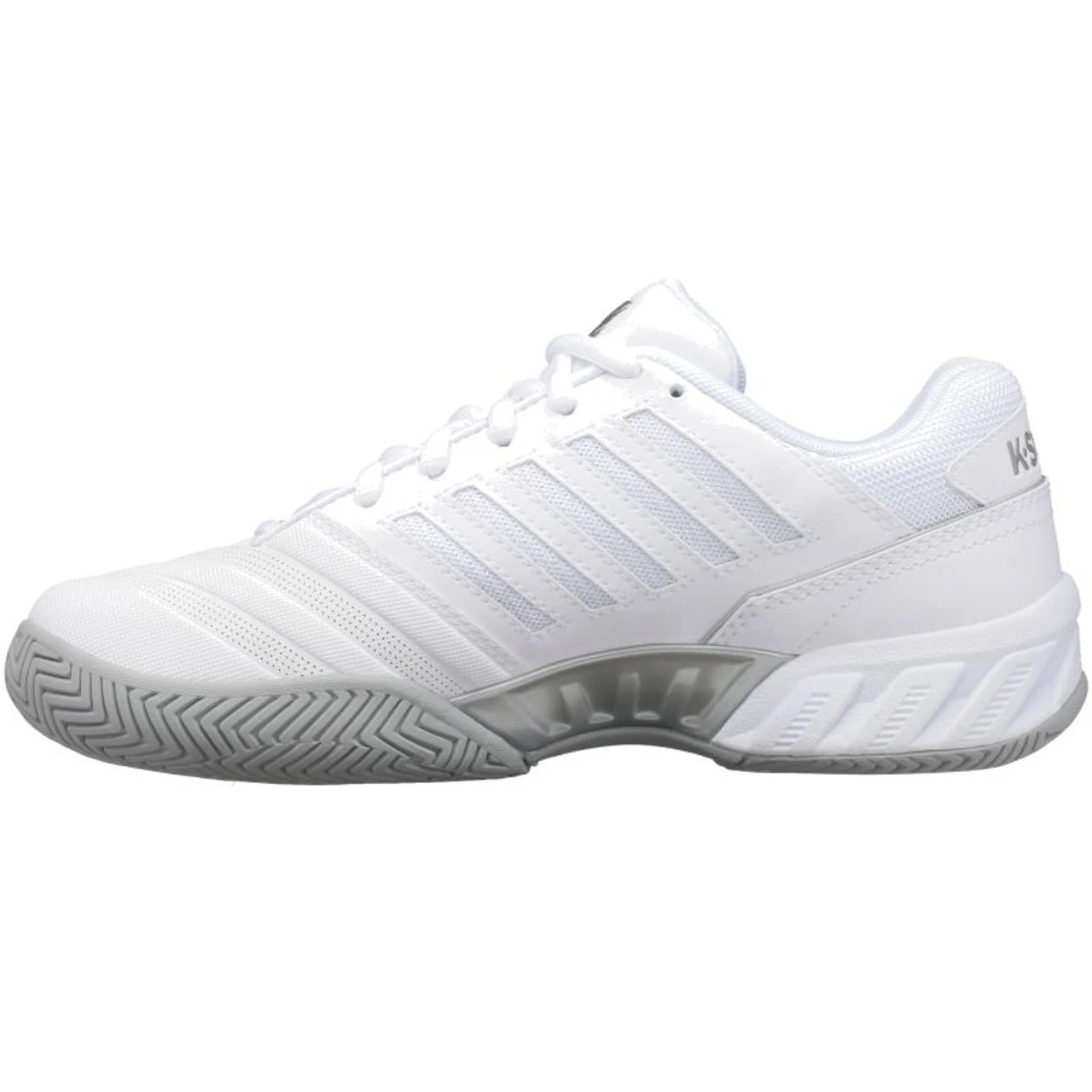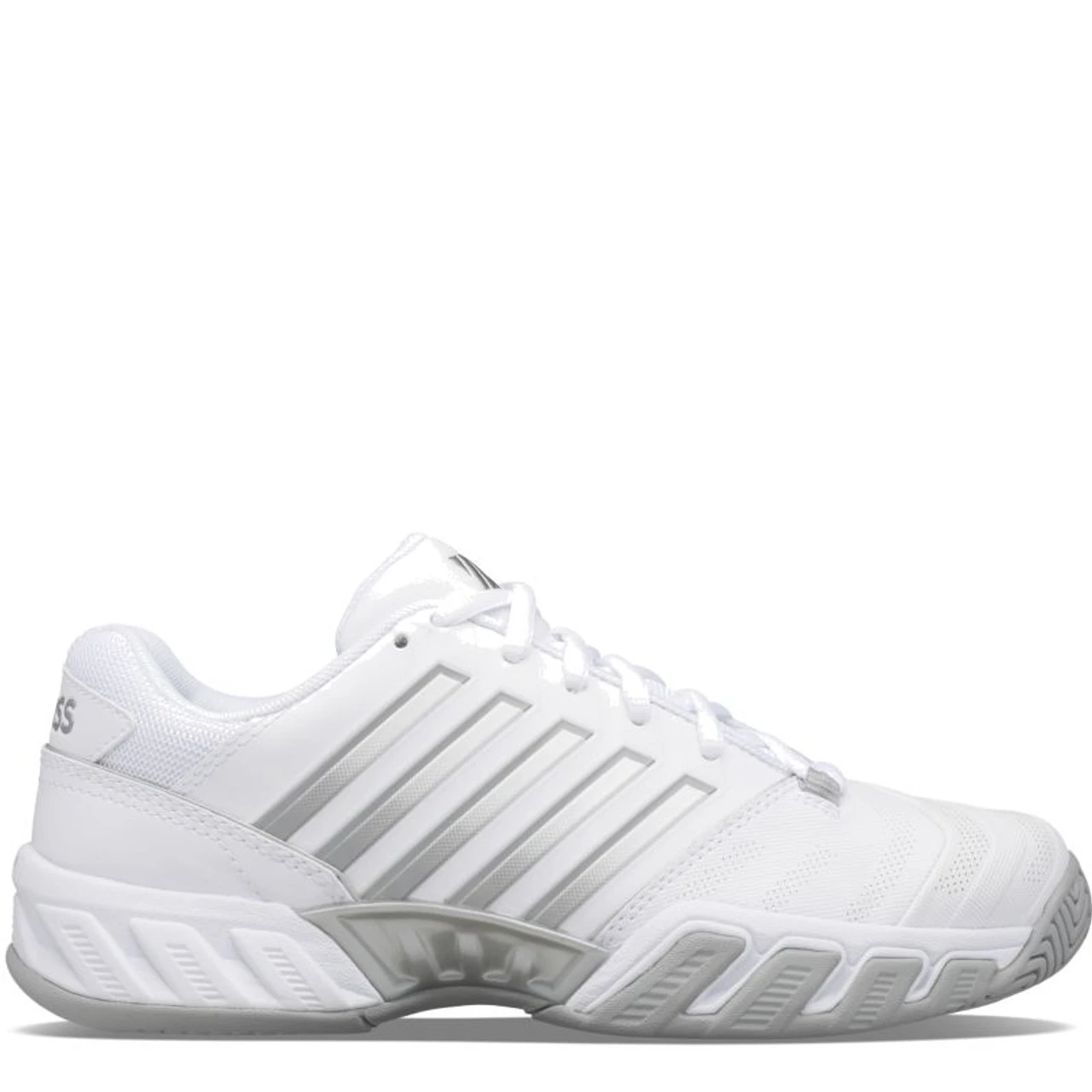 The K-Swiss Bigshot Light 4 court shoe is the latest version in the “Bigshot” line. Â This shoe combines a super stable upper with a wider forefoot and narrower heel for a custom type fit that accommodates many of our players!
