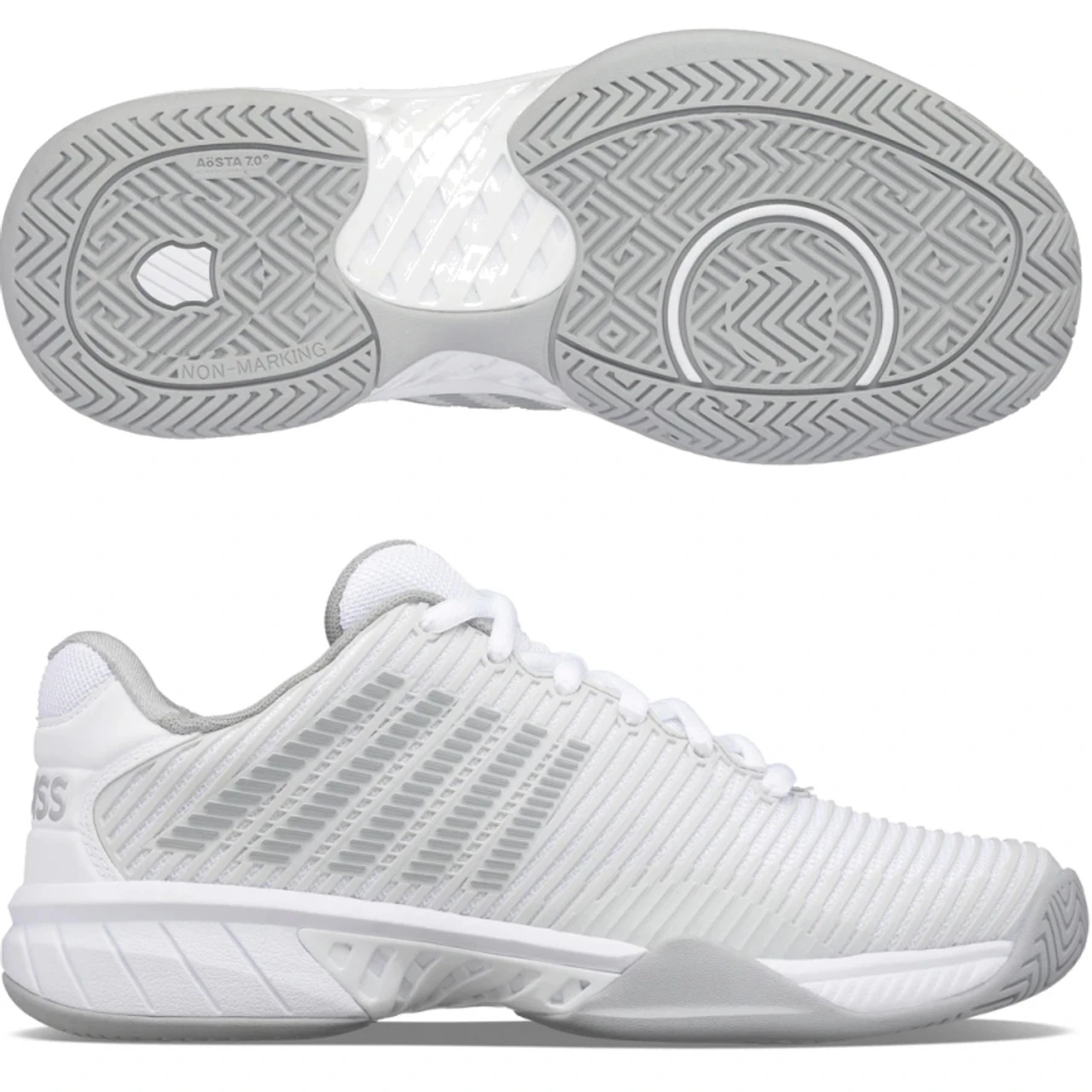 The K-Swiss Hypercourt Express 2 court shoe is the lighter weight version of the original Hypercourt Express. Subtle revisions to the upper enhance stability for a more supportive feel, while the fit has narrowed just slightly making a a shoe that now fits average to wider feet with ease.Â