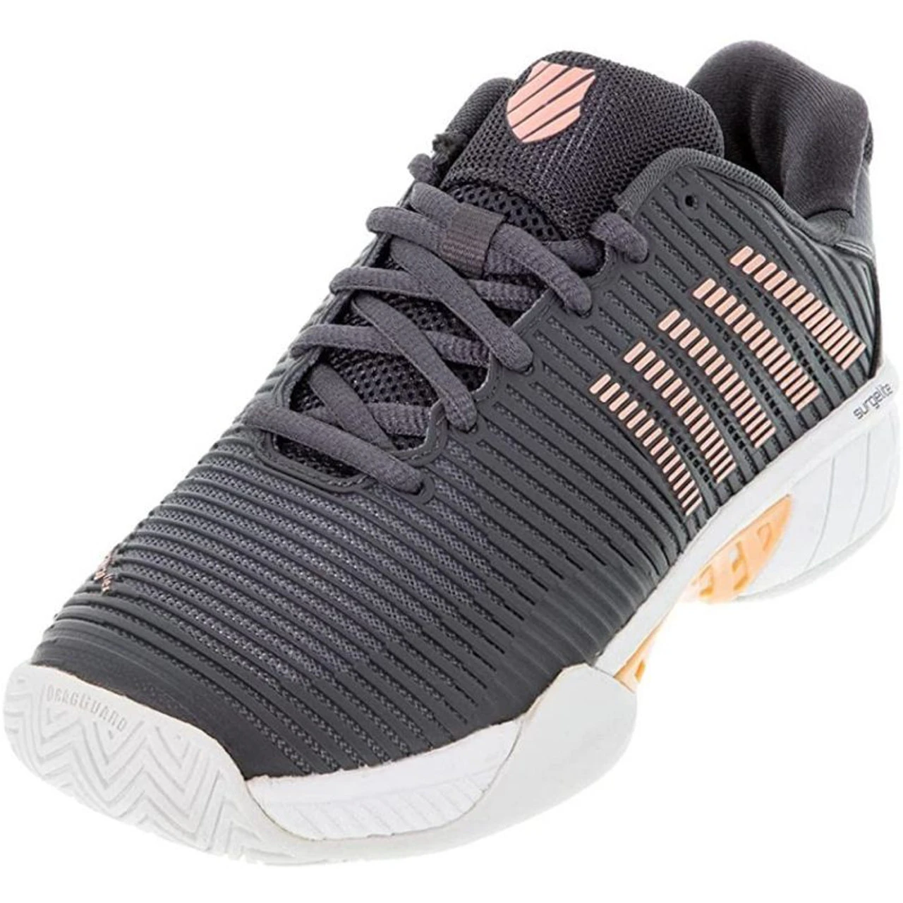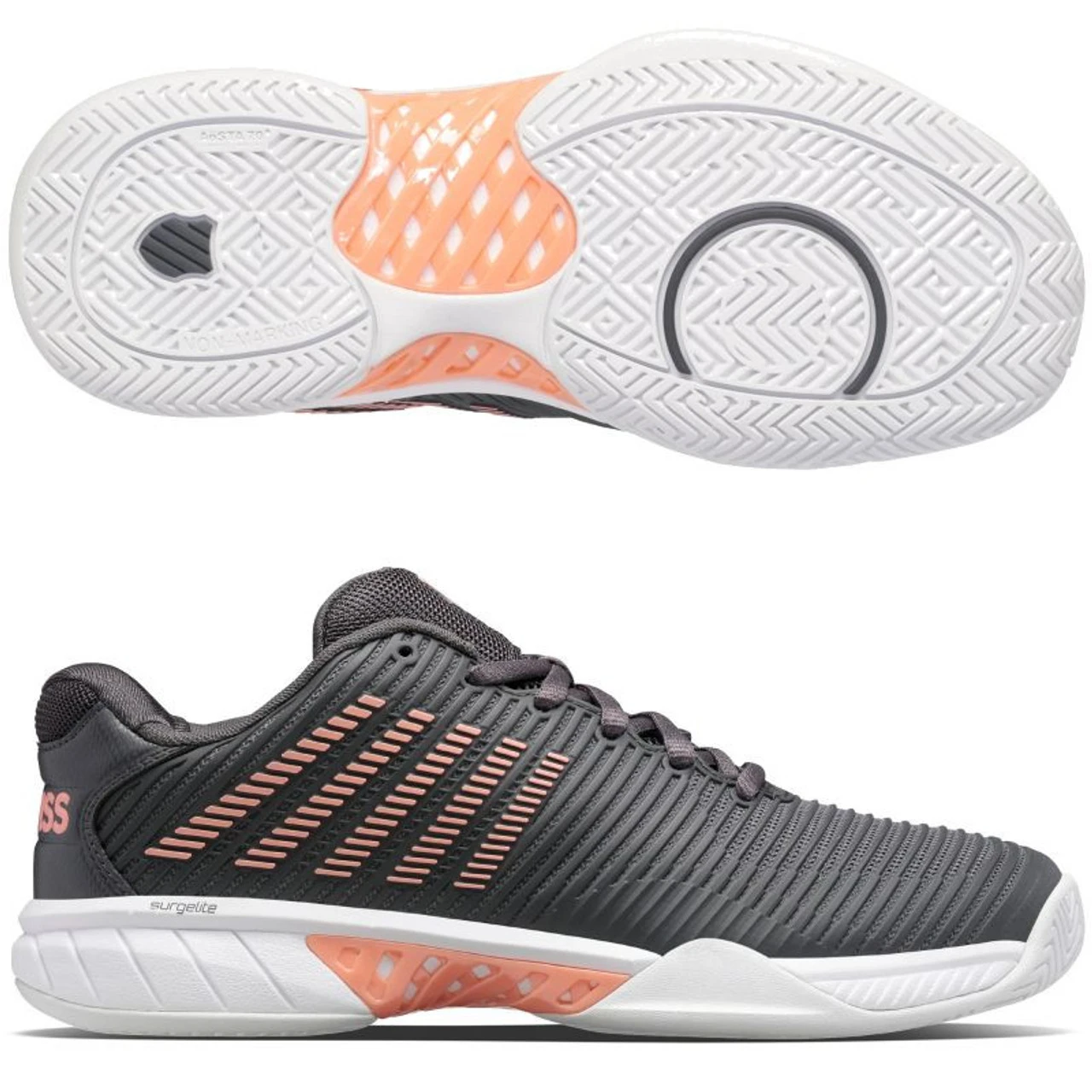 The K-Swiss Hypercourt Express 2 court shoe is the lighter weight version of the original Hypercourt Express. Subtle revisions to the upper enhance stability for a more supportive feel, while the fit has narrowed just slightly making a a shoe that now fits average to wider feet with ease.Â