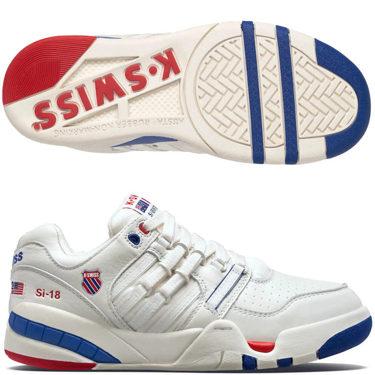 First introduced in 1989, the Si-18 International is an iconic representation of K-Swiss’ dedication to honoring athletic heritage while optimizing performance for future design. This reissue of the award-winning style combines elements of classic K-Swiss tennis, such as a premium leather upper, with innovative engineering that introduced the world to the groundbreaking Silicone Formula 18 for which the shoe is named. Flag accents adorn the heel and tongue to honor the host countries of the Grand Slam, the biggest tournament in tennis. Along with a vintage ski boot-inspired D-R Cinch lacing system and an asymmetric single-density PU midsole, the Si-18 International Heritage provides unmatched comfort and support in a timelessly recognizable silhouette.
