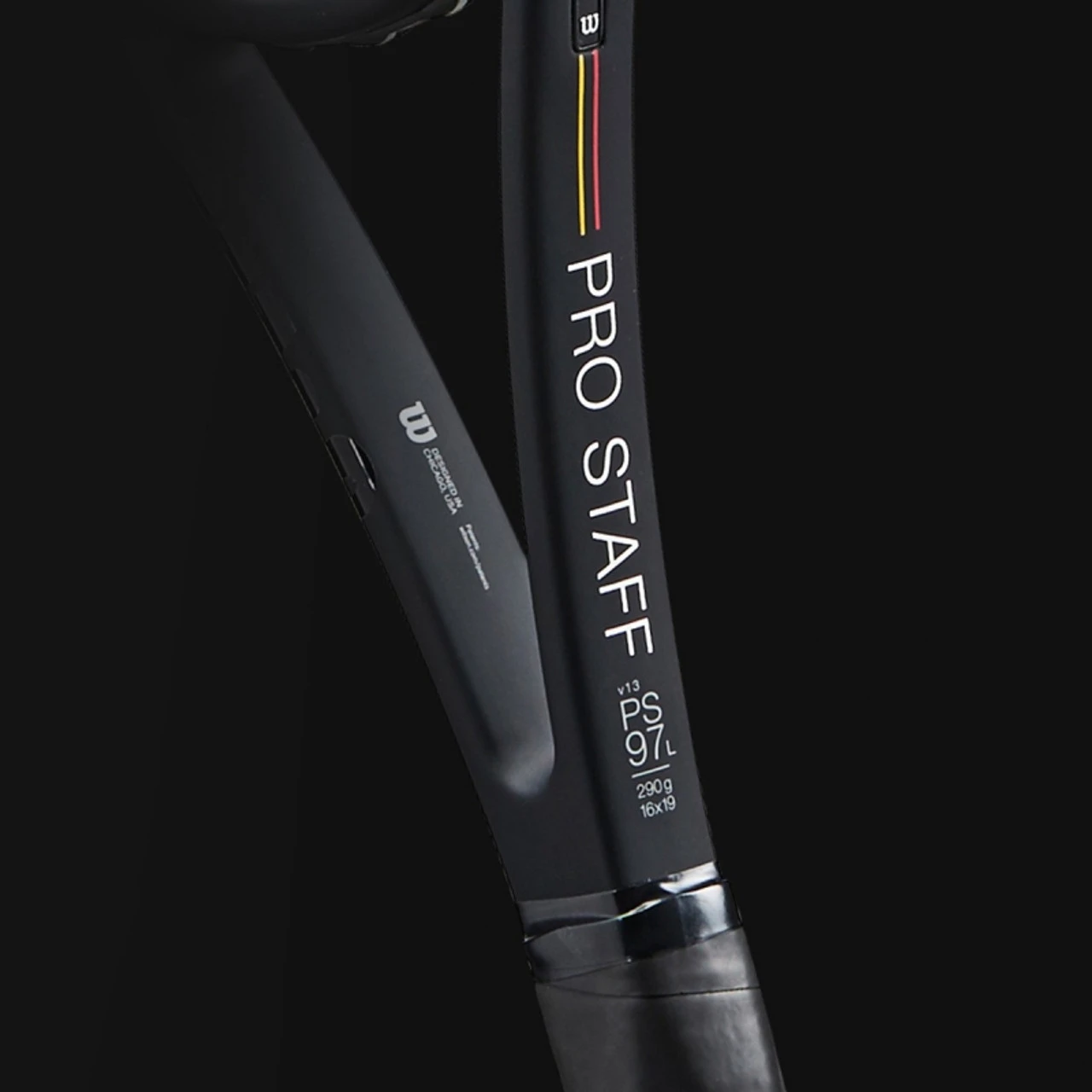 The Pro Staff 97L v13 is a control frame at a more maneuverable weight and with a slighly wider beam for added power. The super cool looking v13 features a design that pays tribute to the historic Pro Staff series with a matte black and partial gloss black finish featuring a small yellow and red pin stripe accent that harkens back to classic Pro Staff models! The Pro Staff 97L v13 showcases a new Braid 45 construction that improves shot-making precision by adjusting the angle of the double braided fibers for enhanced feel and stability. Two additional upgrades to this racquet include a denser string bed that improves consistency on every shot and a new end cap that is used across Wilson’s other performance racket lines for improved comfort and ergonomics.